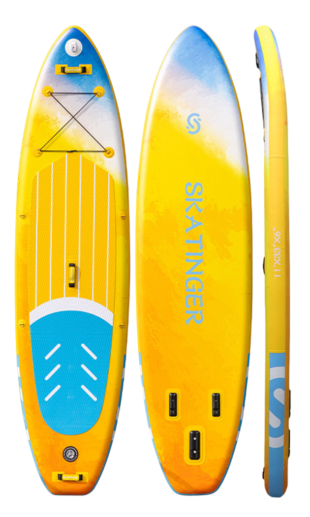 Its sun-washed yellow tones transition into calming blue accents, evoking the feeling of golden beaches and tropical breezes. The single-layer construction keeps the board lightweight, while the 375 L volume and 155 kg weight capacity make it suitable for a wide range of riders.