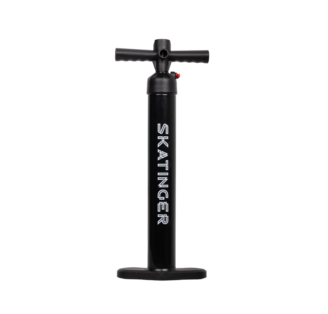 A durable and efficient hand pump designed for inflating stand-up paddle boards. The pump features an ergonomic handle for comfortable use, a large pressure gauge for precise inflation, and a double-action system for faster pumping. Compatible with all Skatinger SUP boards and other inflatable boards with standard valves.