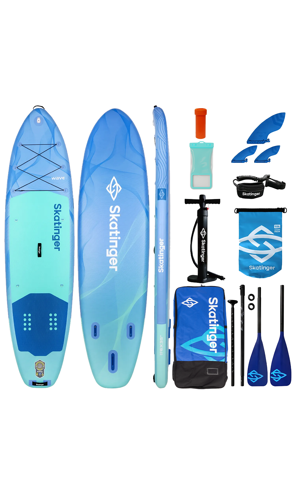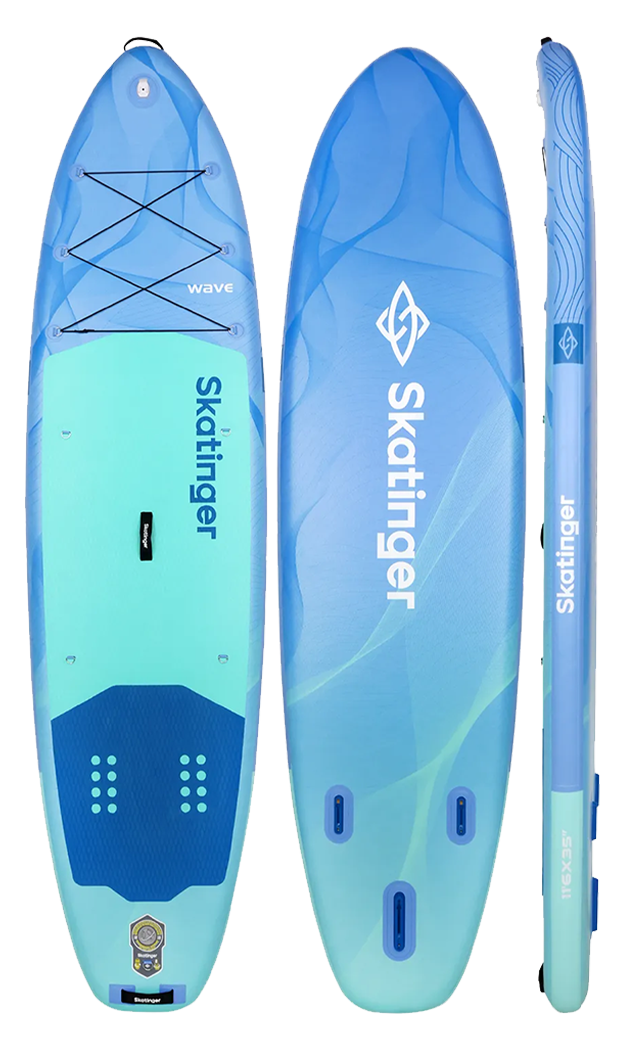 Skatinger Wave Blue napuhiva paddle daska spaja profinjen dizajn s pouzdanim performansama na vodi. S dubokim oceanskim plavim tonovima i fluidnim grafičkim linijama, ova daska prenosi mirnu energiju mora dok istovremeno pruža vrhunsko iskustvo veslanja. Bilo da kliziš preko mirnog jezera ili uživaš u opuštenom krstarenju uz obalu, Wave Blue nudi stil, stabilnost i glatku kontrolu.