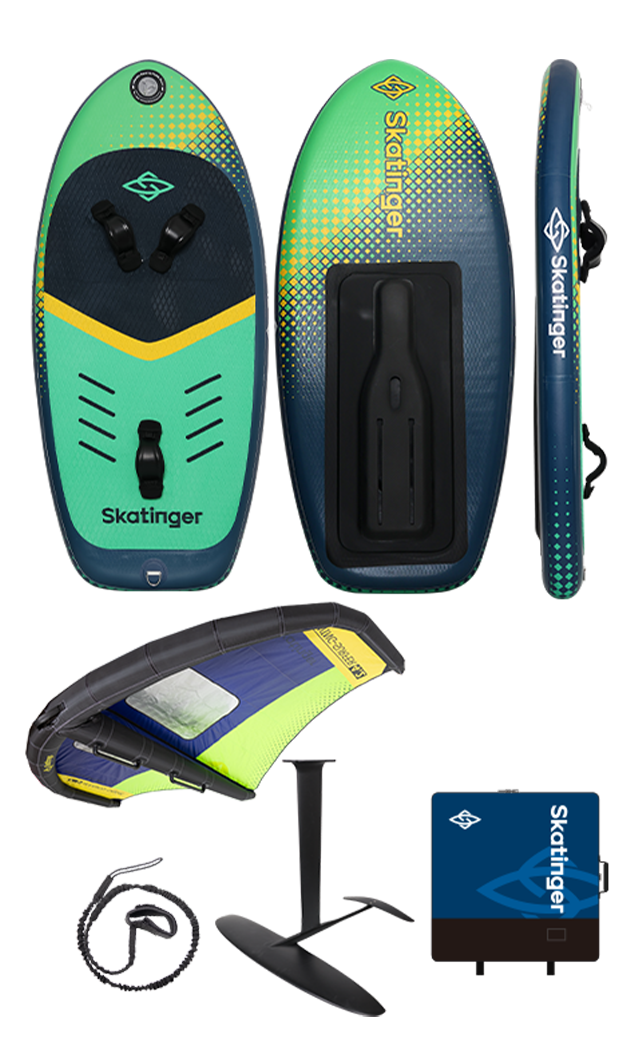 Skatinger napuhujući foil set predstavlja kompletno rješenje koje uključuje sve što vam je potrebno za ulazak u svijet wing foilinga: stabilnu napuhujuću foil dasku, snažno wing krilo (dostupno u različitim veličinama) te visokoučinkovit hidrofoil sustav.