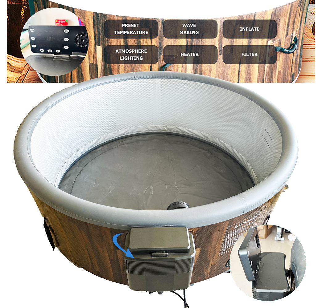 This inflatable round spa pool offers a premium soaking experience with the added durability of Drop Stitch + PVC + EVA materials. Whether set up in a garden, patio, or terrace, it combines comfort and rugged design to create a spa-like environment at home or in shared outdoor spaces.