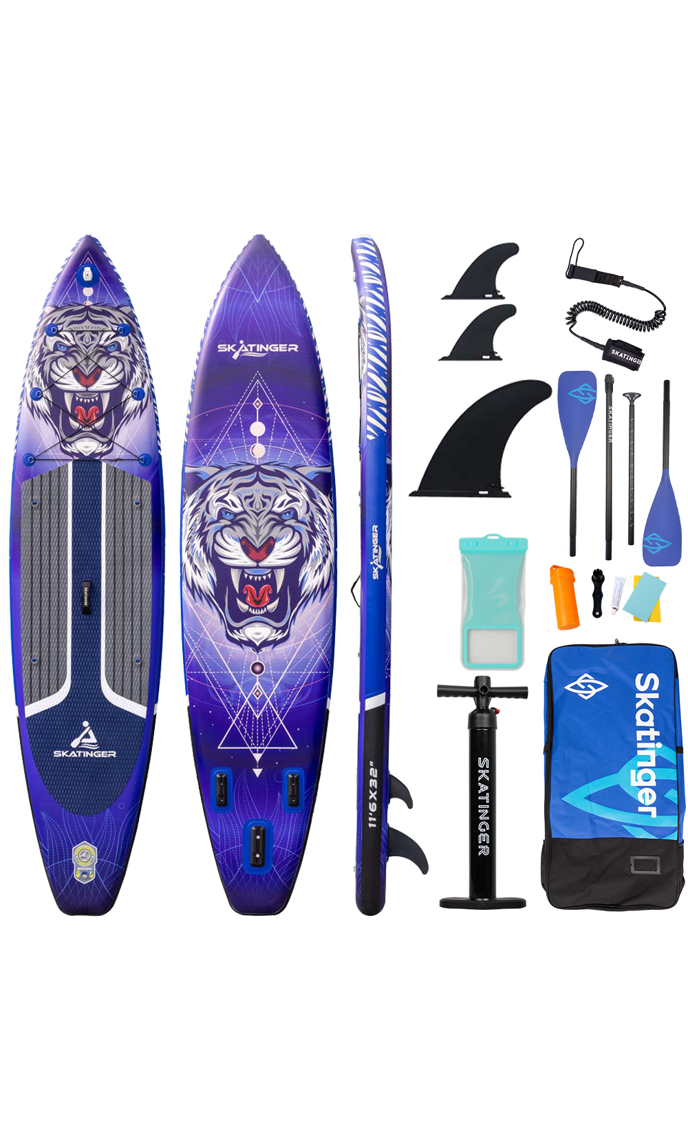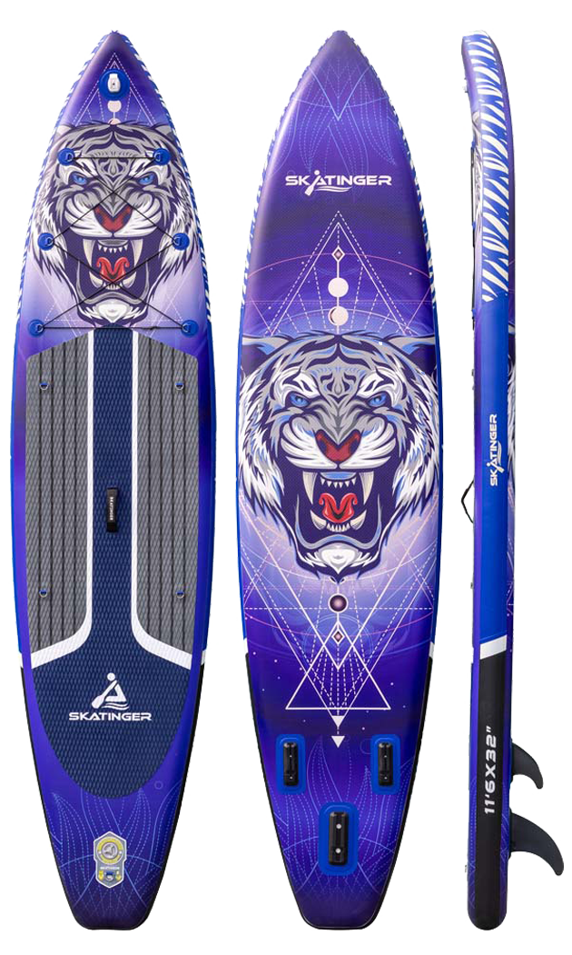 Napuhujuća touring daska Tiger brenda Skatinger osmišljena je za veslače koji traže avanturu i udaljenost. S duljinom od 350.5 cm i širinom od 81.3 cm pruža izvanredno klizanje, stabilno praćenje pravca i sigurnost – savršeno za istraživanje jezera, rijeka ili obale s punim povjerenjem.